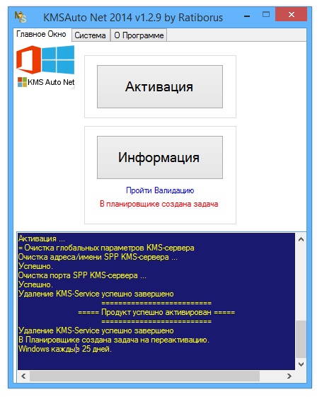 - /task=yes — Старт программы в invisible mode, создание задачи в диспетчере Task Manager по активации Microsoft Office или Windows и затем закрытие программы. Примечание: Периодичность активации — происходит каждые 25 дней. Лицензионный ключ можно использовать вместе с ключами /off=act и /win=act