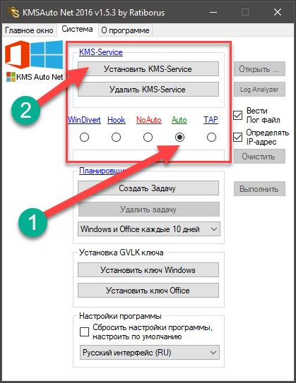 Далее в верхнем блоке требуется кликнуть по кружочку возле пункта «Auto». После жмём на «Установить KMS-Service».