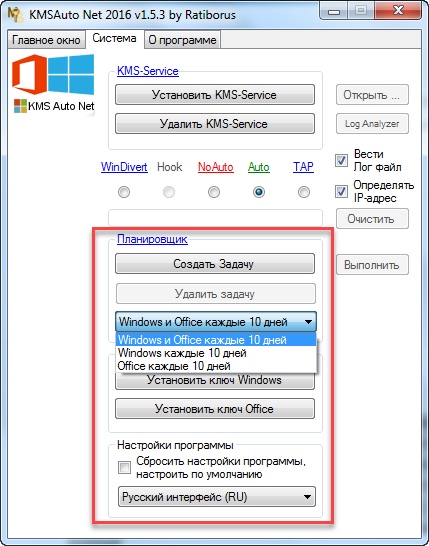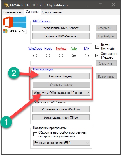 - auto — проводится автоматический выбор среди всех все имеющихся способов взлома OS Windows или MS Office. Отбирается первый подходящий способ. Он запоминается устройством и будет использоваться позднее, при повторном генерировании лицензионного ключа. В планировщике будет создана периодическая задача, а операция осуществляется через инсталлируемую службу. Этот метод используется по умолчанию и открывается в окне выбора режимов. Его можно сбросить, выбрав для этого другие режимы работы KMSAuto, после чего вернув авторежим. В итоге начнётся повторный поиск оптимальных вариантов получения ключа.